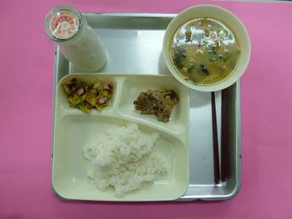 今日の献立は、ご飯、豚肉の甘辛焼き、味噌汁、たことキャベツの炒め物、牛乳です。