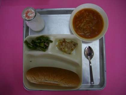 今日の献立は、ライ麦パン、かつおのマヨネーズ焼き、フレッシュトマトのミネストローネ、グリーンアスパラガスのソテー、牛乳です。
