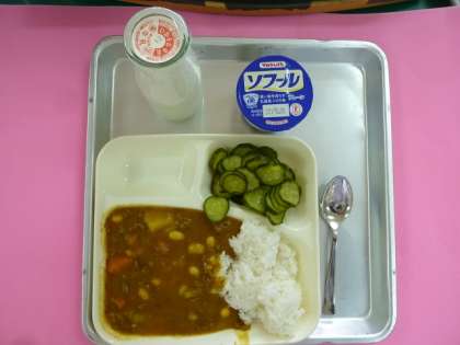 今日の献立は、牛肉と大豆のカレーライス、きゅうりのピクルス、ヨーグルト、牛乳です。