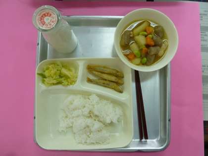 今日の献立は、ご飯、きびなご天ぷら、鶏肉とじゃがいもの煮物、あっさりキャベツ、牛乳です。