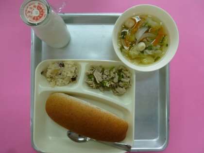 今日の献立は、ライ麦パン、豚肉とピーマンの炒め物、すまし汁、金時豆のおこわ、牛乳です。