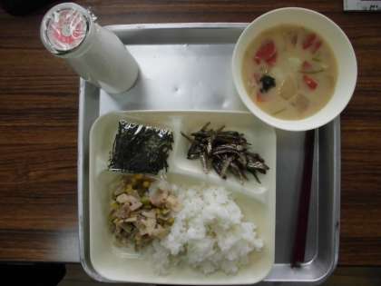 今日の献立は、れんこんのちらしずし、ぞうに、ごまめ、牛乳です。