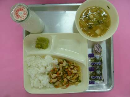 今日の献立は、かやくご飯、味噌汁、抹茶ういろう、牛乳です。