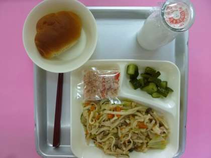 今日の献立は、2分の1黒糖パン、焼きうどん、きゅうりの酢のもの、牛乳です。