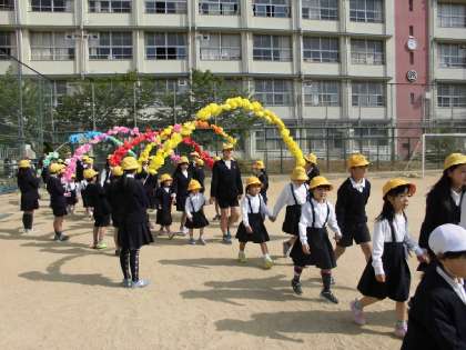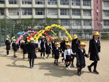 4月13日(金)入学おめでとう集会がありました。6年生と手をつないで入場してきた1年生はにこにこ顔でした。
