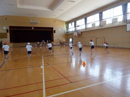 50m走、ソフトボール投げ、立ち幅跳び、上体起こし、長座体前屈、反復横跳び、20mシャトルラン、握力などを学年の応じて測定します。写真は、20mシャトルランの様子です。