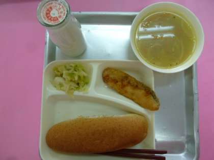 今日の献立は、ライ麦パン、サーモンフライ、コーンスープ、キャベツのソテー、牛乳です。