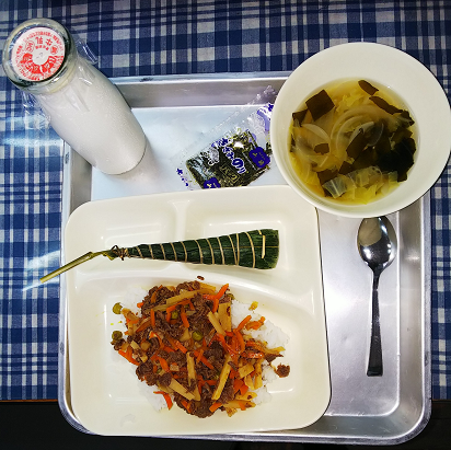 今日の献立は、牛肉のちらし寿司、すまし汁、ちまき、牛乳です。
