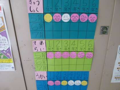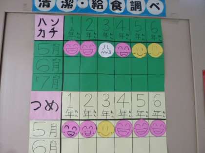 昨日、児童朝会で、保健委員会が発表した「清潔・給食週間」の結果が掲示してあります。