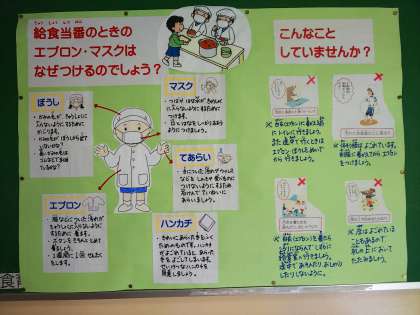 給食当番のときに、エプロンとマスクをなぜつけるのかを掲示しています。