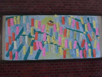 玄関の掲示は、4年生です。いろいろな願いが書かれています。