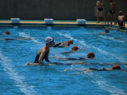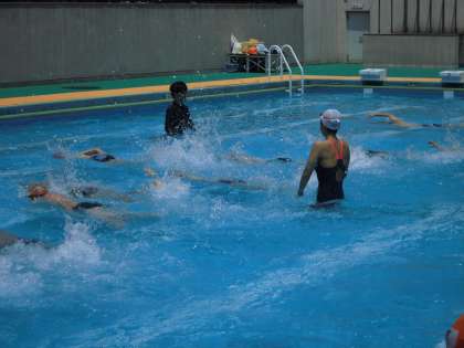 プールでは、模範演技を見学し、クロールと平泳ぎについて教えていただきました。