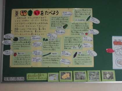 職員室横の「食育の掲示板」には、「夏野菜を食べよう」について掲示しています。