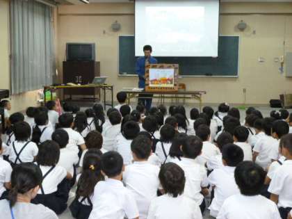 天王寺動物園の方に来ていただいて、戦争中の動物園の出来事を紙芝居で話していただきました。子ども達は、戦争中の悲しい出来事を知り、平和の大切さを学習しました。