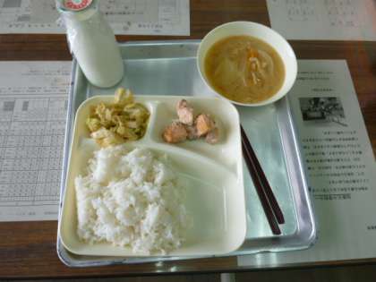今日の献立は、ごはん、さけの香味焼き、味噌汁、キャベツの胡麻和え、牛乳でした。