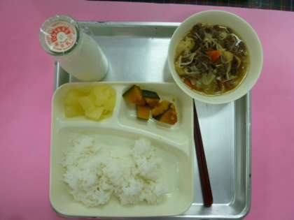 今日の献立は、ご飯、すき焼きに、かぼちゃの醤油焼き、りんご(缶)、牛乳です。