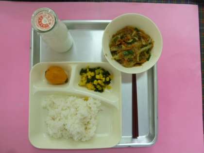 今日の献立は、ご飯、マーボー春雨、チンゲンサイとコーンの甘酢あえ、びわ、牛乳です。