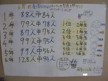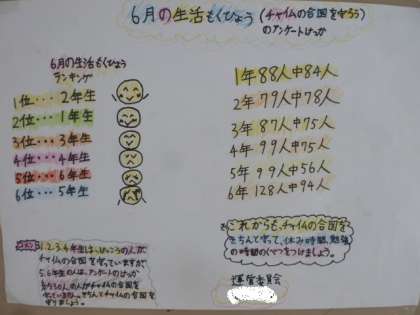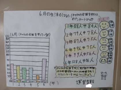 運営委員会の子ども達が、生活目標「チャイムの合図を守ろう」のアンケートをとり、まとめた結果をポスターにしました。