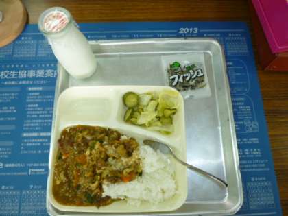 今日の献立は、和風カレー丼、キャベツときゅうりのゆず風味、ミニフィッシュ、牛乳でした。