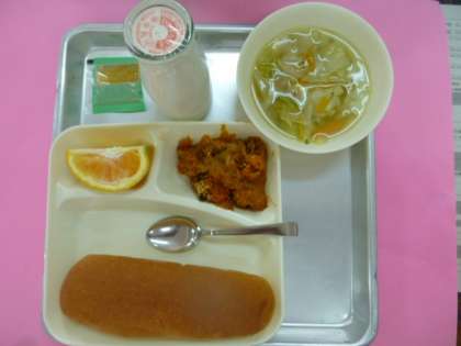 今日の献立は、コッペパン、りんごジャム、かぼちゃのミートグラタン、スープ、オレンジです。