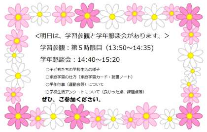 明日は、学習参観と学年懇談会です。