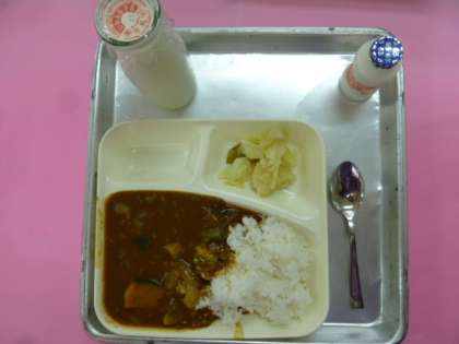 今日の献立は、夏野菜のカレーライス、キャベツのサラダ、発酵乳、牛乳です。
