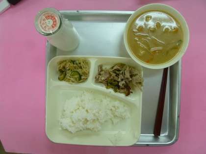 今日の献立は、ご飯、豚肉の梅風味焼き、みそ汁、もやしときゅうりのおひたし、牛乳です。