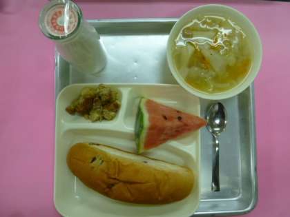 今日の献立は、レーズンパン、スパイシーチキン、ウインナーとじゃがいものスープ、すいか、牛乳です。