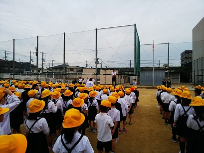 1つ目は、先生のお話をしっかり聞いて活動することです。運動会の練習では、広い場所で、いろいろな隊形で活動します。そこでは、普段の教室での勉強と違って、少し集中しにくいことがあるかもしれません。しっかり顔を上げて、気持ちごとしっかり先生に向けて、集中して先生のお話をしっかり聞いて、頑張りましょう。