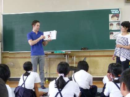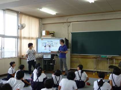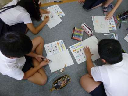 カードで、“Can you play badminton?”“Yes,I can./No,I can't”の復習をした後、自分のできることを紙に描いて発表しました。