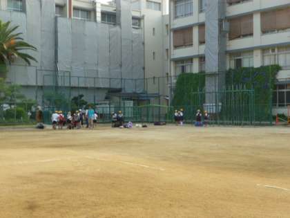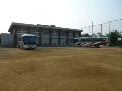 林間学習に出発する朝の運動場の様子です。