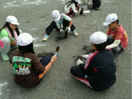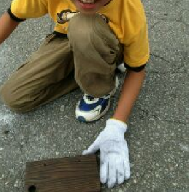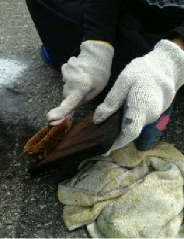焼き板作り、しっかりこすって磨いています。