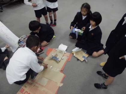 2年生が、生活科と図画工作科で作ったおもちゃで、「おもちゃランド」をしています。招待された1年生は楽しそうです。