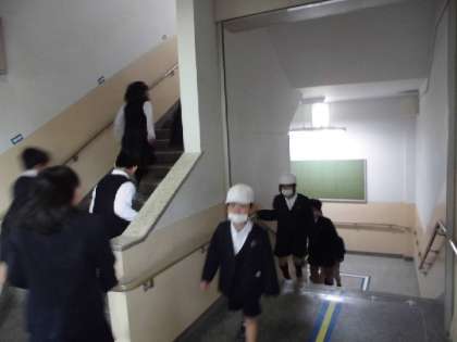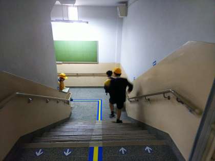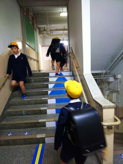 廊下・階段は、右側を歩くことについて、子どもたちの意識を持たせるために階段の踊り場のところにラインを引きました。