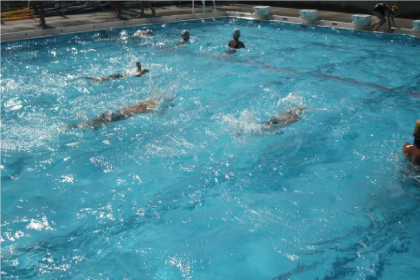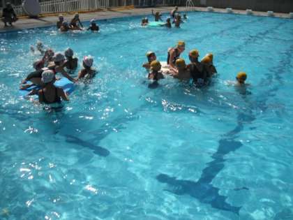 5年生と6年生のプール開放の様子です。25mをクロール・平泳ぎでしっかり泳いだ後、水泳版騎馬戦?のようなゲームをしました。