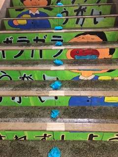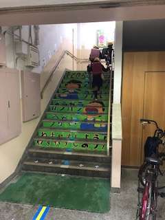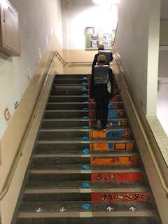 今週は、フラワーロード週間ということで、階段の中央に花ちり紙で作った花を貼っています。これは、子どもたちが右側通行を意識できるようにと考えられた取組です。さっそく子どもたちも気づいて右側を歩いていました。この意識が習慣化されるといいですね。