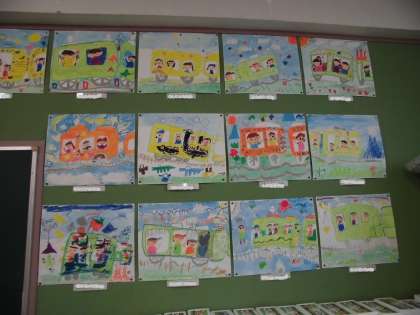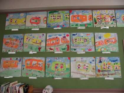 1年生の教室の掲示板には、かわいい電車の絵が・・・