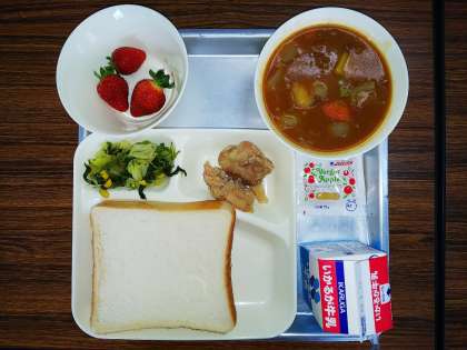 今日の献立は、食パン、りんごジャム、フライドチキン、カレーシチュー、春のカラフルソテー、いちご、牛乳です。