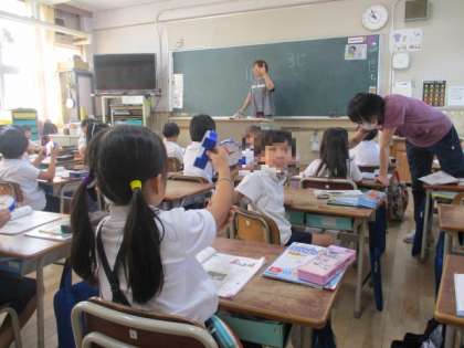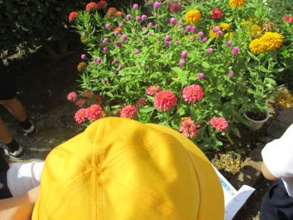 学校の庭でバッタやダンゴムシ、チョウを見つけています。