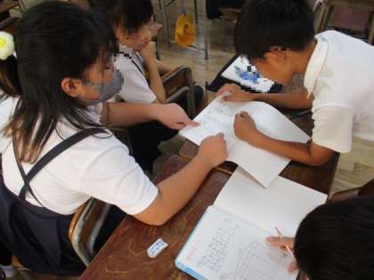 国語、算数ともに小グループで教え合いをしていました。