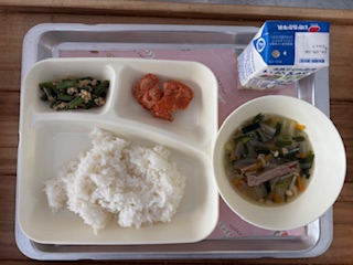 今日の献立は「鶏肉のチリソース焼き・焼き豚のスープ・ツナとさんどまめのいためもの・ごはん・牛乳」です。いためものはツナが入って、さんどまめも食べやすかったです。
