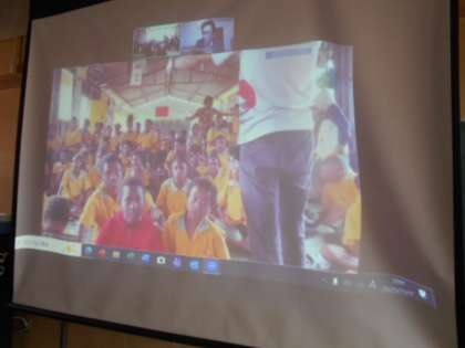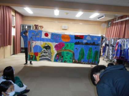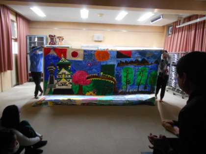 6年生も、ソゲリ小学校の児童と交流しました。6年生は、7月に交流したことを振り返り、互いの思い出を語り合いました。最後に両校で制作した壁画を披露しました。1枚は加美北小学校、もう1枚はソゲリ小学校に掲示する予定です。