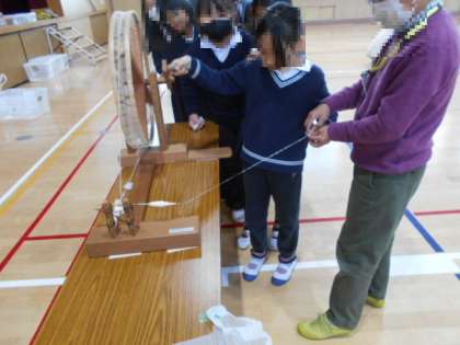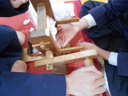 わたから、糸をつくったり、機織り機の体験をしたりしました。