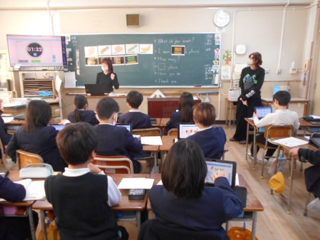 4年生「外国語」What do you want? 好きな果物を選び、タブレットでパフェを描きます。