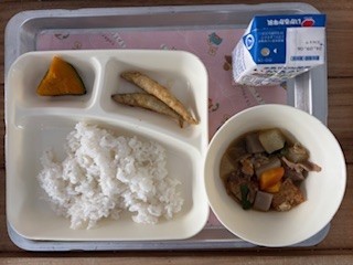19日 ごはん・きびなごてんぷら・豚肉とあつあげの煮もの・焼きかぼちゃの甘みつかけ・牛乳