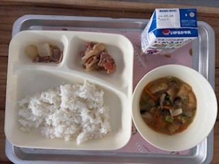 23日ごはん・鶏肉の甘辛焼き・みそ汁・だいこんの煮もの、牛乳です。