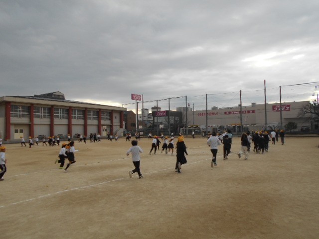 15分休みに耐寒持久走を行っています。今日は、1,3,5年生が走りました。