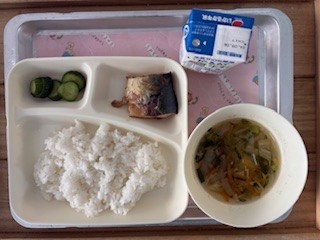 今日はさばのみそ煮・五目汁・きゅうりの甘酢づけ・ごはん・牛乳です。さばに骨が多かったですが、