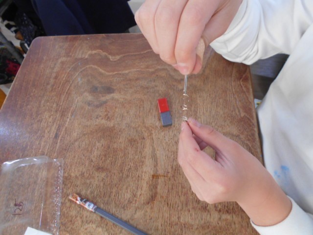じしゃくについた鉄はじしゃくになるということを学ぶ実験をしました。