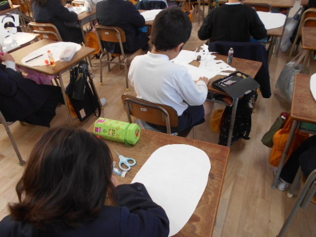 図工「紙版画」 紙版画のために、仮面づくりをしているところです。
